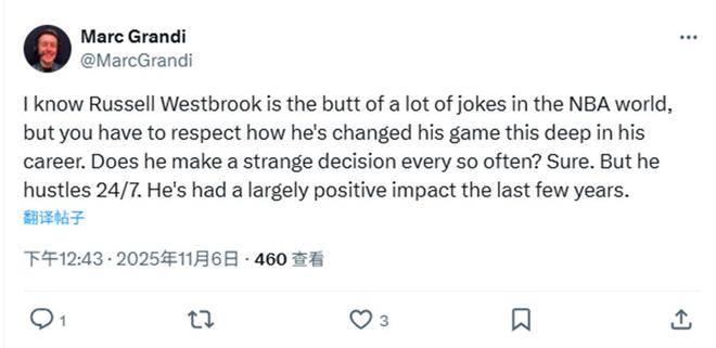 美记Marc Grandi则更加真诚的表示:“我知道NBA世界中有很多人都会拿威少来开玩笑,但你不得不佩服他在职业生涯后期如此出色地改变了自己的比赛方式,哪怕他偶尔会做出一些奇怪的决定,但他24小时永远保持拼搏,过去几个赛季一直交出积极正向的表现。”
